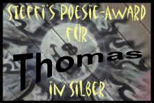 " Ich habe mir heute - am 05.09.1999 - Deine Webpage angeschaut und verleihe Dir hiermit "Steffi's Poesie Award" in Silber. " |